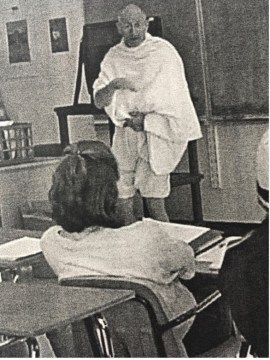 Asking the teachers to prepare their students for my appearance, rather Gandhi’s visit, I recommended students read a Newsweek article identifying key details of Gandhi’s life. The middle-schoolers now familiar with highlights from Gandhi’s career covered in Newsweek, I anticipated three student questions: How did you feel on your march to the sea? Do you think it okay to break the law? How can people be nonviolent when others are hurting them?