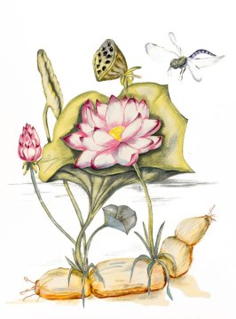 For my first drawing, βLotus Plantβ, I researched and focussed on all the interconnecting parts of the plant. Most drawings and paintings of the lotus concentrate on the flower itself; the next part, the stem, is submerged and thus often merely hinted at. And the roots, although many of us will be familiar with them as edible parts of the plant, are rarely depicted in art, since they grow deep in the muddy bed of the pond.