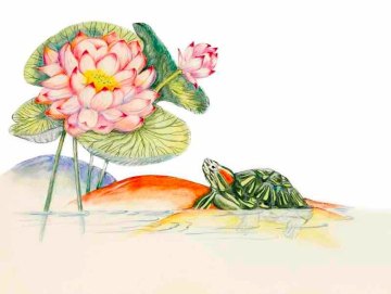 My βLotus Pond with Tortoiseβ shows the flowering plant, partly in water, and blooming just at the surface. A tortoise, resting on a rock, looks up at the lotus. Such a bright and beautiful flower is an inspiration to all who see it, tortoise as much as human.